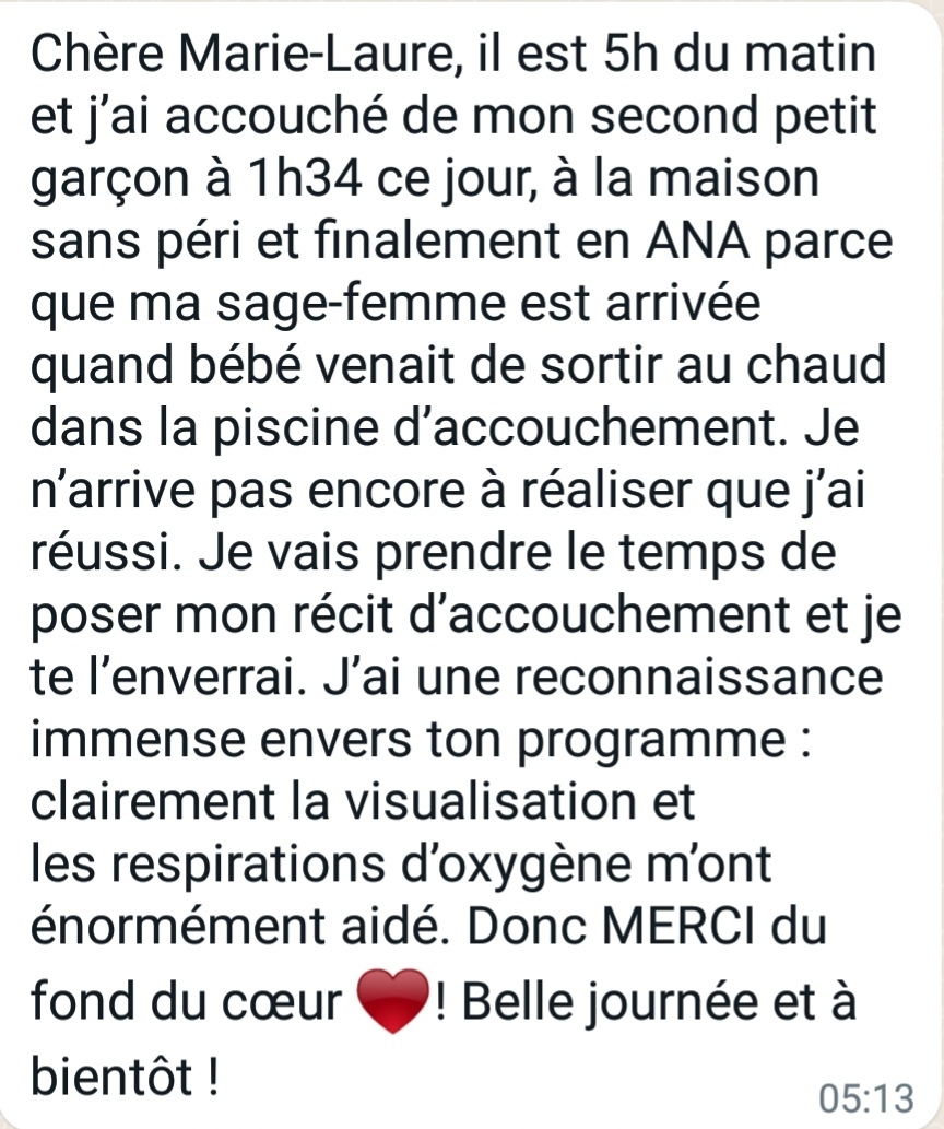 Grâce à la visualisation positive de l'accouchement que nous avons effectuée ensemble tu connais chaque étape. Tu n'as pas peur, tu laisses faire.