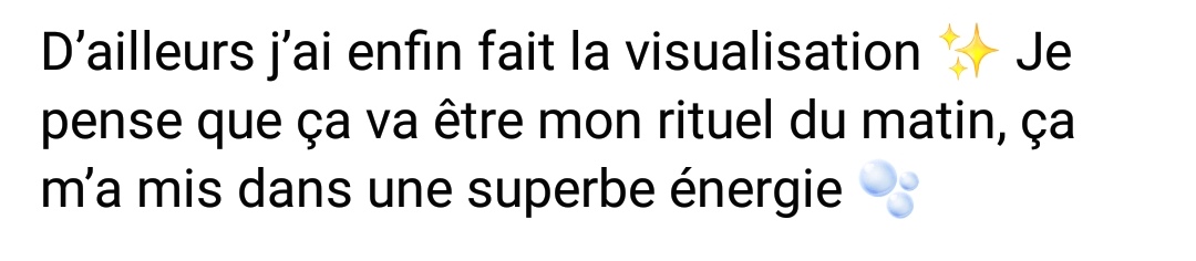 La visualisation "La bulle de naissance™" dure 50 min. Elle est à faire en fin de grossesse, plusieurs fois avant ton accouchement. Je t'explique comment faire évoluer ta pratique pour qu'elle soit de plus en plus efficace.